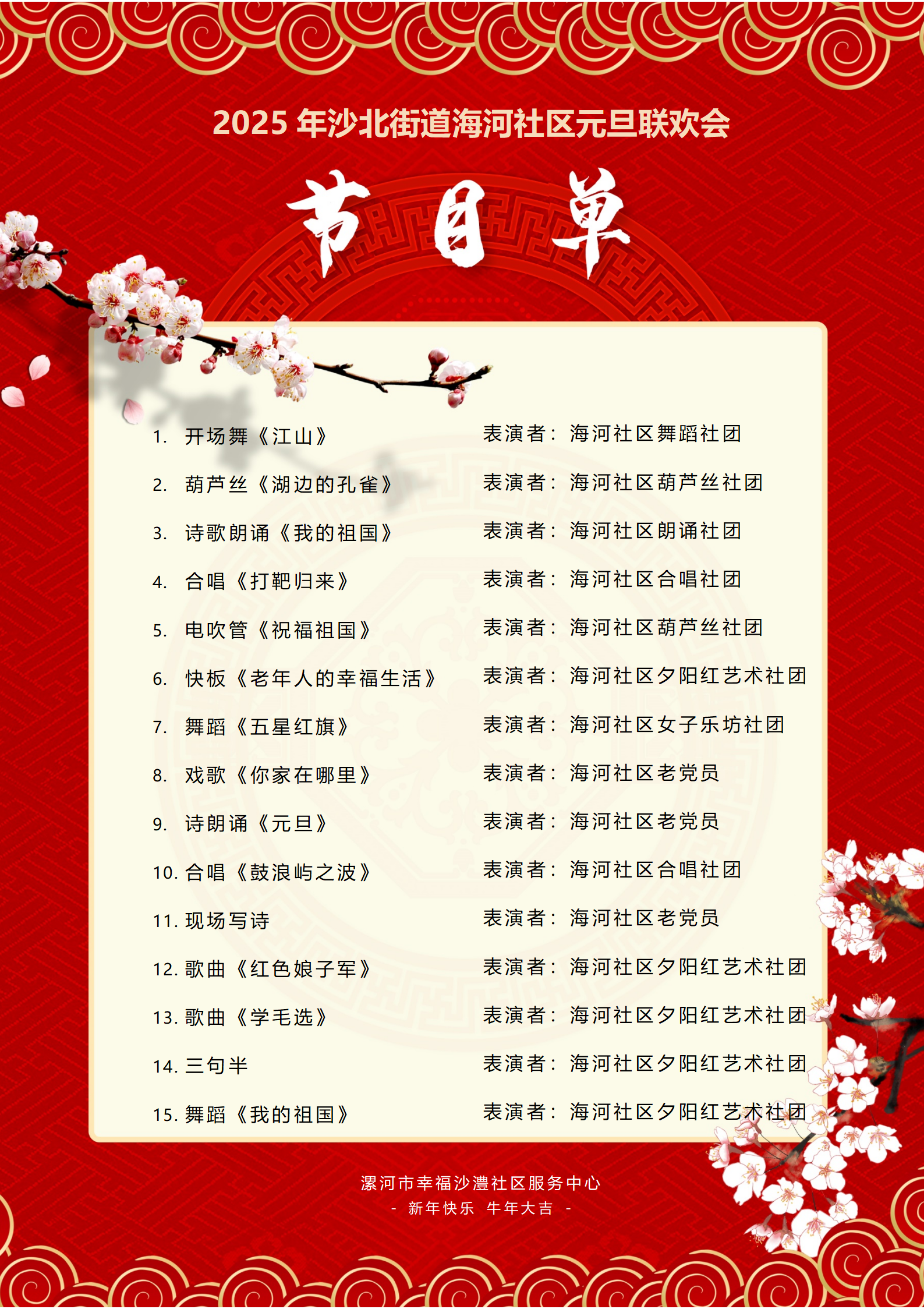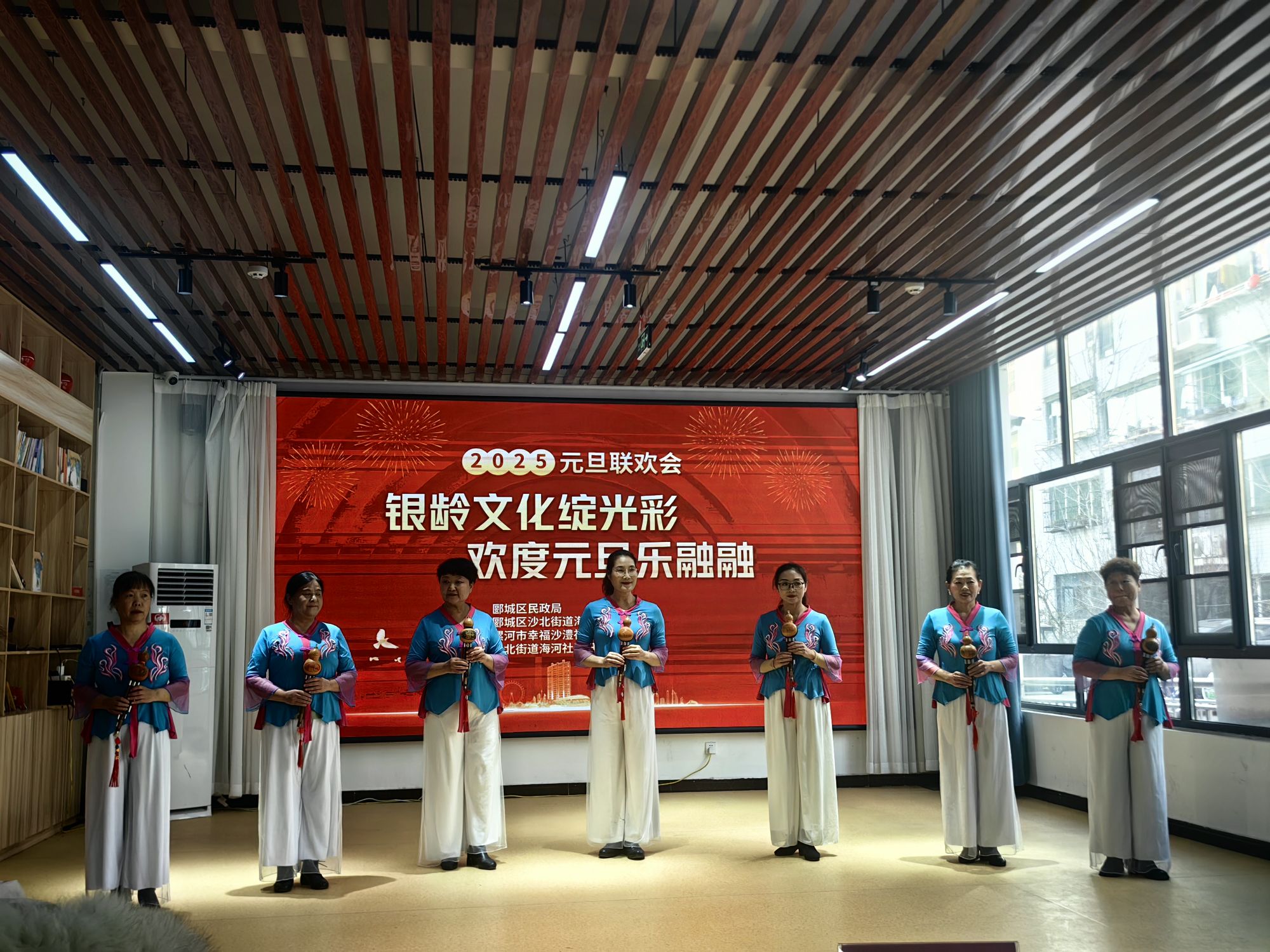 联欢会在热烈而喜庆的氛围中徐徐拉开帷幕,所有节目皆由社区银龄文艺社团精心策划、自编自导自演。开场舞蹈《江山》中,老人们身着华丽服饰,舞姿优美,精神矍铄,展现了积极向上的精神风貌。紧接着,葫芦丝独奏《湖边的孔雀》悠扬婉转的旋律萦绕耳畔,将观众们带入了一个静谧祥和、如诗如画的艺术之境,令人沉醉其中。