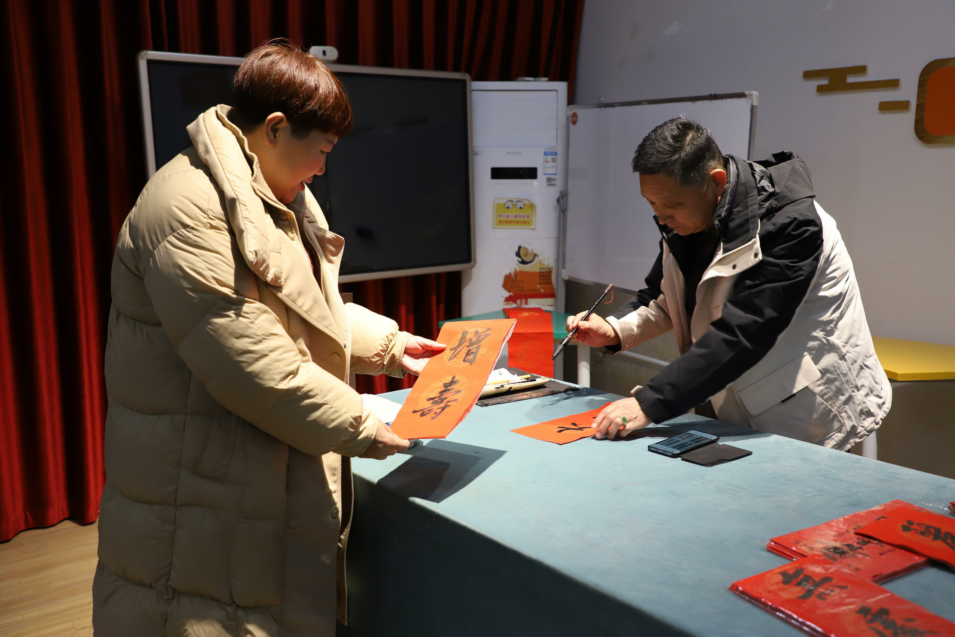 活动现场,慈善书画院院长赵明华先生偕同夫人应邀亲临,为活动增添了一抹亮丽的文化色彩。他们笔走龙蛇、挥毫泼墨,现场为老年朋友们书写一幅幅饱含新春祝福的春联和一个个寓意吉祥的福字,送上了真挚而美好的新年祝愿。这一幅幅笔墨飘香的春联、一个个红红火火的福字,不仅承载着书法家们对老年朋友们的深情厚谊与美好期许,更传递出浓郁醇厚的节日喜庆氛围。