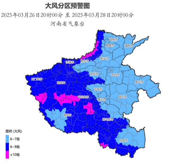 河南省气象台2025年3月26日16时发布大风蓝色预警:受强冷空气影响,预计3月26日夜里到28日白天,全省大部西北风或偏北风5级左右,阵风7到8级,其中安阳西部、新乡西部、焦作北部、三门峡南部、洛阳南部、平顶山、南阳北部、驻马店西部、信阳南部局部阵风10到11级。全省大部伴有浮尘或扬沙。请注意防范。