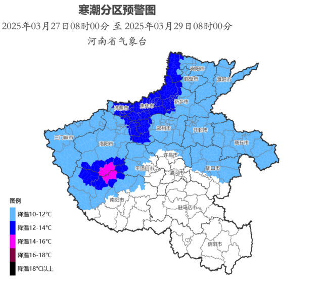 河南省气象台2025年3月26日16时发布寒潮蓝色预警:预计3月27日到29日,全省最低气温自北向南先后下降10度以上,安阳西部、新乡西部、焦作、济源、郑州西部、洛阳北部和南部、南阳北部下降12度以上。29日和30日的凌晨最低气温西部、北部、东部0度到3度,其中西部山区零下3度到零下1度;其他县市4度到6度。请注意防范。上述地区的相邻县(市、区)也需关注。