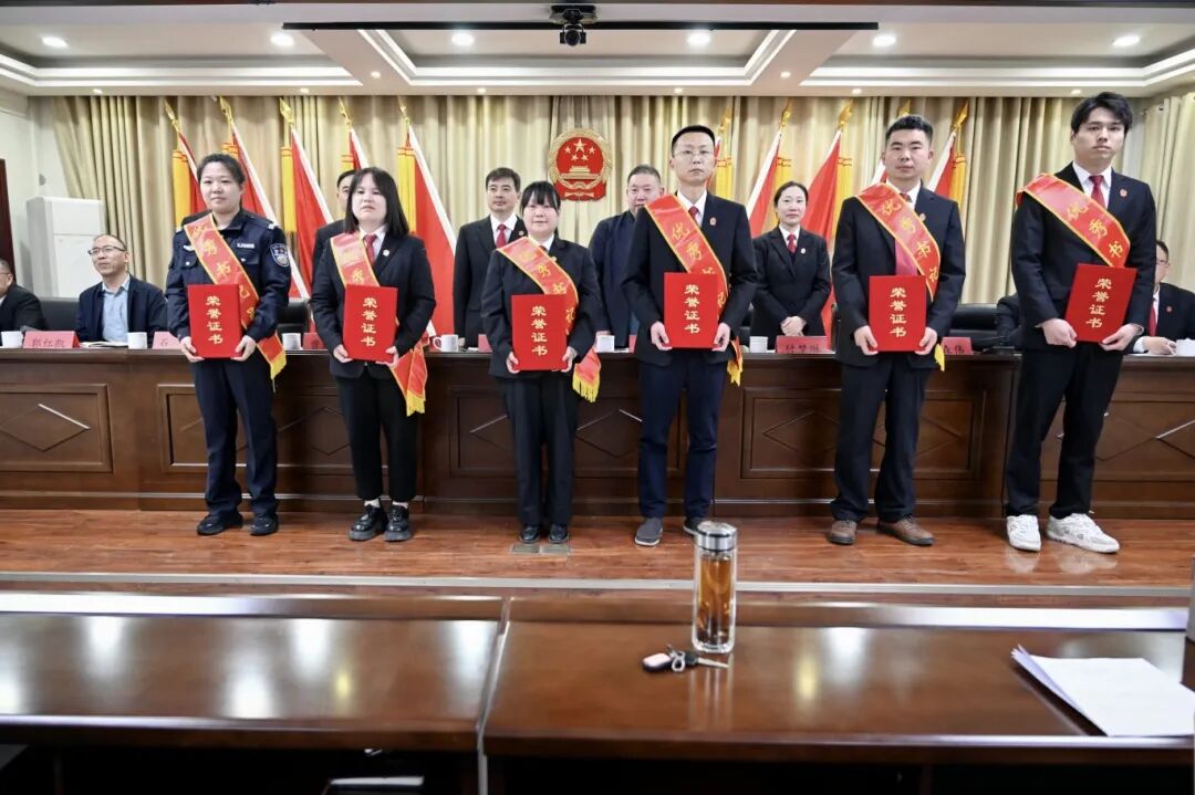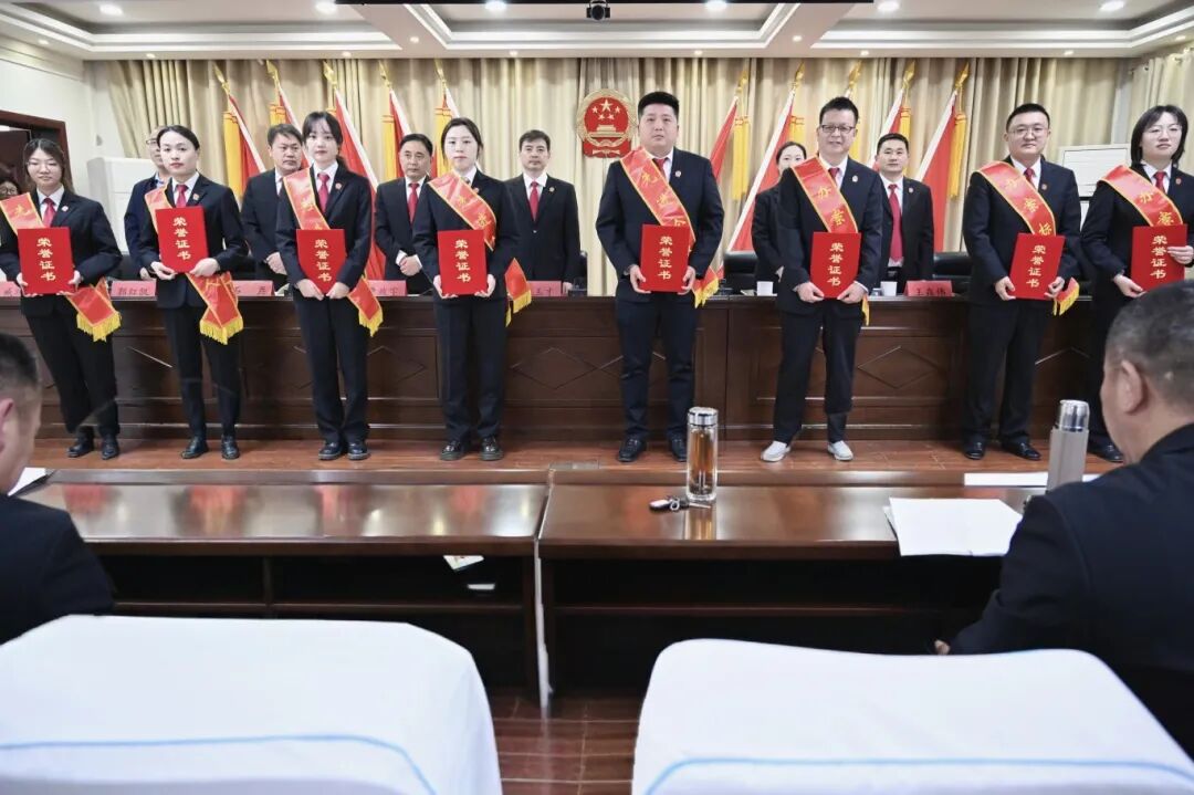 会上,院党组成员、副院长付梦琳传达了全国两会精神,以及中央和省委、市委、县委政法工作会议精神;院党组成员、执行局局长石磊传达了省委、市委、县委纪委全会精神;院党组成员、政治部主任王森伟宣读了《关于对2024年度先进集体、先进个人的表彰通报》;受表彰干警上台领奖,并作交流发言;审委会专职委员臧跃峰通报下一阶段质效目标。