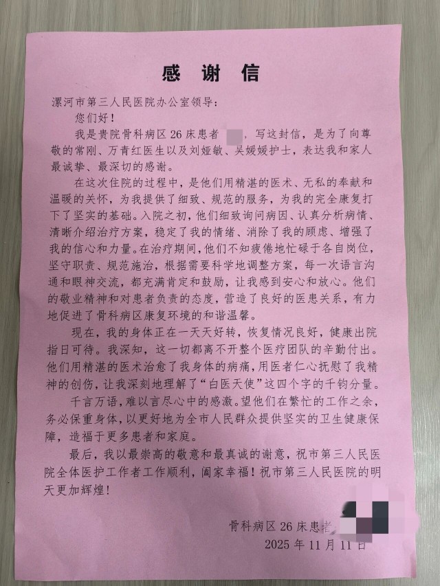 金杯银杯不如群众的口碑,群众认可就是最好的褒奖。11月11日,市三院(市妇幼保健院)行风办公室接到一通来电,一位病区患者点名表扬骨科医护人员,更在随后亲手将感谢信送到科室,这是群众对医院工作最大的认可和鼓励。