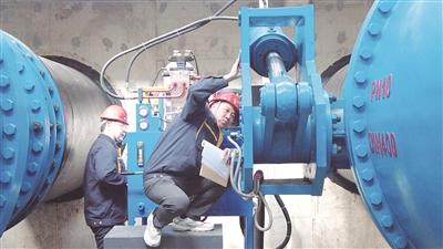 随后,记者与李映昊、刘闯一起下到大约7米深的井底。在井底,记者看到,两台直径1.6米的水泵轰轰作响。刘闯先到水泵旁的仪表盘前察看。手电筒的光照在表盘上,每一组数字都在标准范围内。接着,他蹲下身,眼睛几乎贴在水泵的密封环处,将手电筒的光聚在黑色密封圈上,伸手摸了摸密封圈,发现没有松动的痕迹。