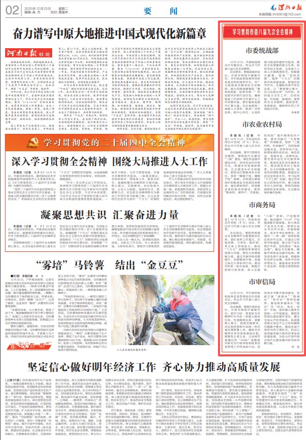 会议强调,要学习贯彻全会精神,围绕现代化漯河“三城”建设,锚定农业强市建设目标,加快农业农村现代化,构建乡村发展新格局,扎实推进乡村全面振兴。要坚决扛稳粮食安全责任,坚持“藏粮于地、藏粮于技”战略,全面落实耕地保护和粮食安全党政同责要求,强化耕地保护,持续推进高标准农田建设,聚焦“稳面积、提单产、夯基础、防风险”提升粮食综合产能。要争当践行“大食物观”的领跑者,坚持“三链同构、农食融合”,加快发展设施农业,培育特色产业,统筹发展科技农业、绿色农业、质量农业、品牌农业。要完善农业社会化服务体系,提高农业社会化服务水平,稳妥推进农村土地改革,壮大村级集体经济,拓宽农民增收渠道。要建设宜居宜业和美乡村,学习运用“千万工程”经验,通过先导区示范带动作用,着力改善农村人居环境,持续巩固拓展脱贫攻坚成果,扎实推动城乡融合发展。