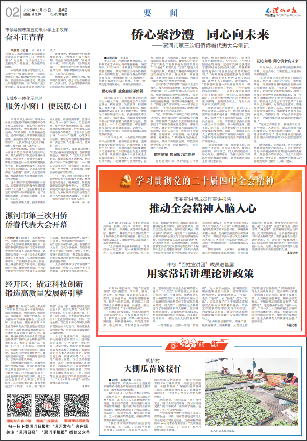 12月18日至24日,市委宣讲团成员刘涛、张燕、吕为华、周菲菲、刘碧莹、韩巧灵、李晨曦、黄伦峰奔赴各县区、各部门、各单位作学习贯彻党的二十届四中全会精神宣讲报告,推动全会精神入脑入心,确保党中央决策部署在基层落地落实。