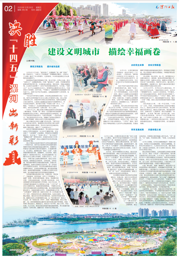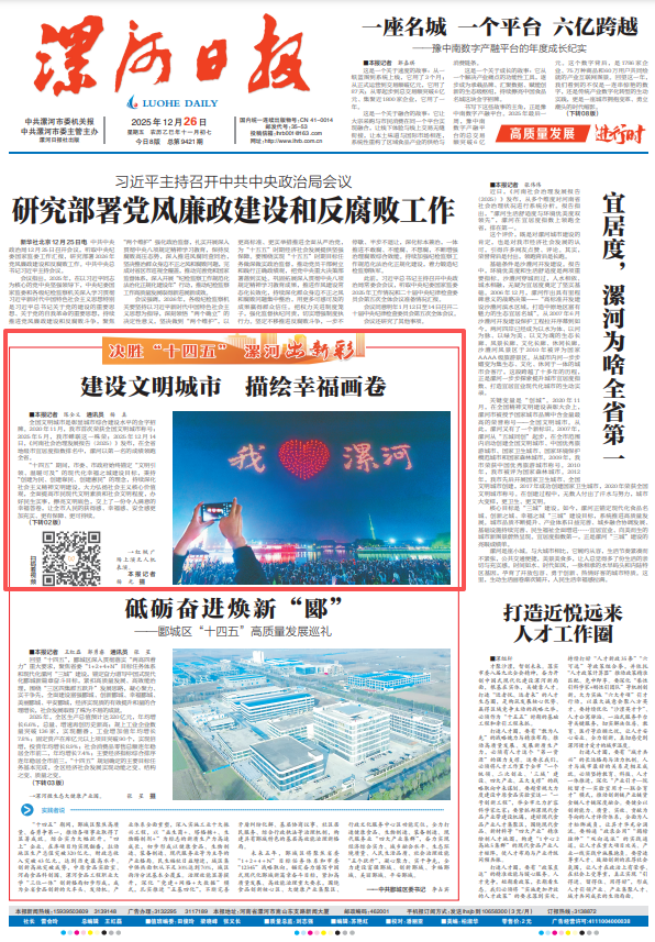 全国文明城市是彰显城市综合建设水平的金字招牌。2020年11月,我市首次荣获全国文明城市称号;2025年5月,我市蝉联这一殊荣;2025年12月14日,《河南社会治理发展报告(2025)》发布,在全省地级市宜居度指数排名中,漯河以第一名的成绩领跑全省。