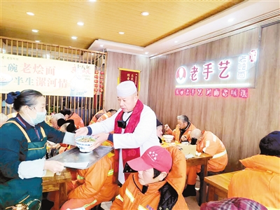 “19日那天特别冷,我看环卫工人在街上打扫卫生,就想着请他们吃饭。”王四海说。当天,他提前和环卫部门联系好,备足了食材。上午11点多,30多位环卫工人走进饭店。一碗碗热气腾腾的烩面端上桌,面条的香气裹着暖意,从舌尖直达心底,瞬间驱散了冬日的寒意。
