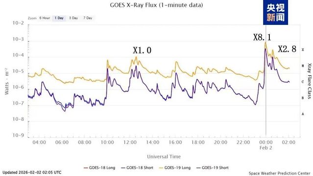 记者从中国气象局国家空间天气监测预警中心了解到,北京时间2月1日20时至2月2日9时,太阳活动区14366连续3次爆发X级耀斑,其中,今早8时左右爆发的耀斑达到X8.1级,是今年太阳出现的最强耀斑过程,同时也是2024年10月以来最强耀斑过程。