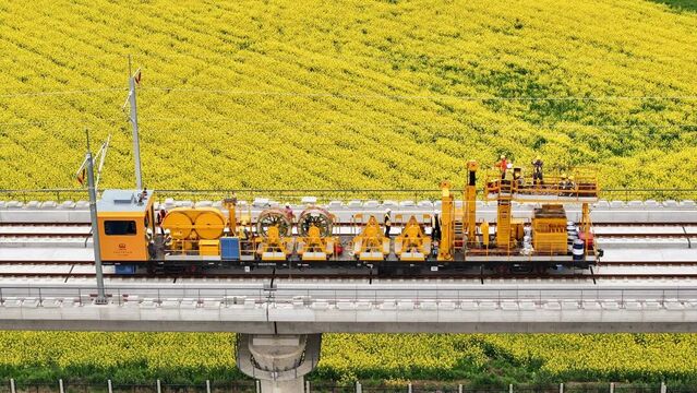 接触网导线架设是高铁“四电”(通信、信号、电力和电气化)工程的关键环节。据介绍,此次架设过程中,项目团队采用恒张力放线设备,通过实时监测并动态调整架线参数,将导线张力、平直度误差精准控制在0.1毫米以内。