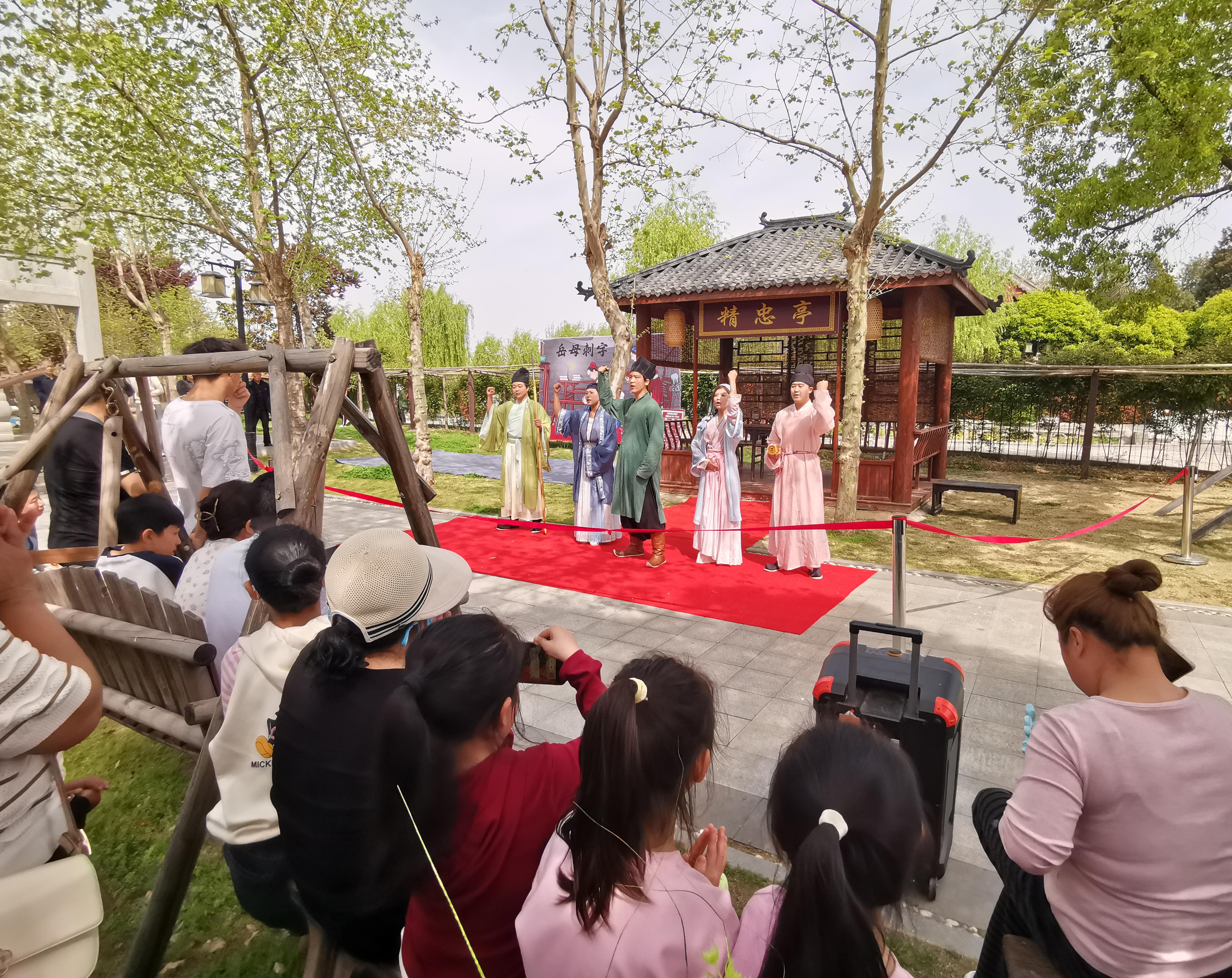 传承忠勇精神,厚植家国情怀。四月五日,在小商桥景区精忠亭前,由景区精心编排的《岳母刺字》情景剧上演,吸引众多游客驻足观看。